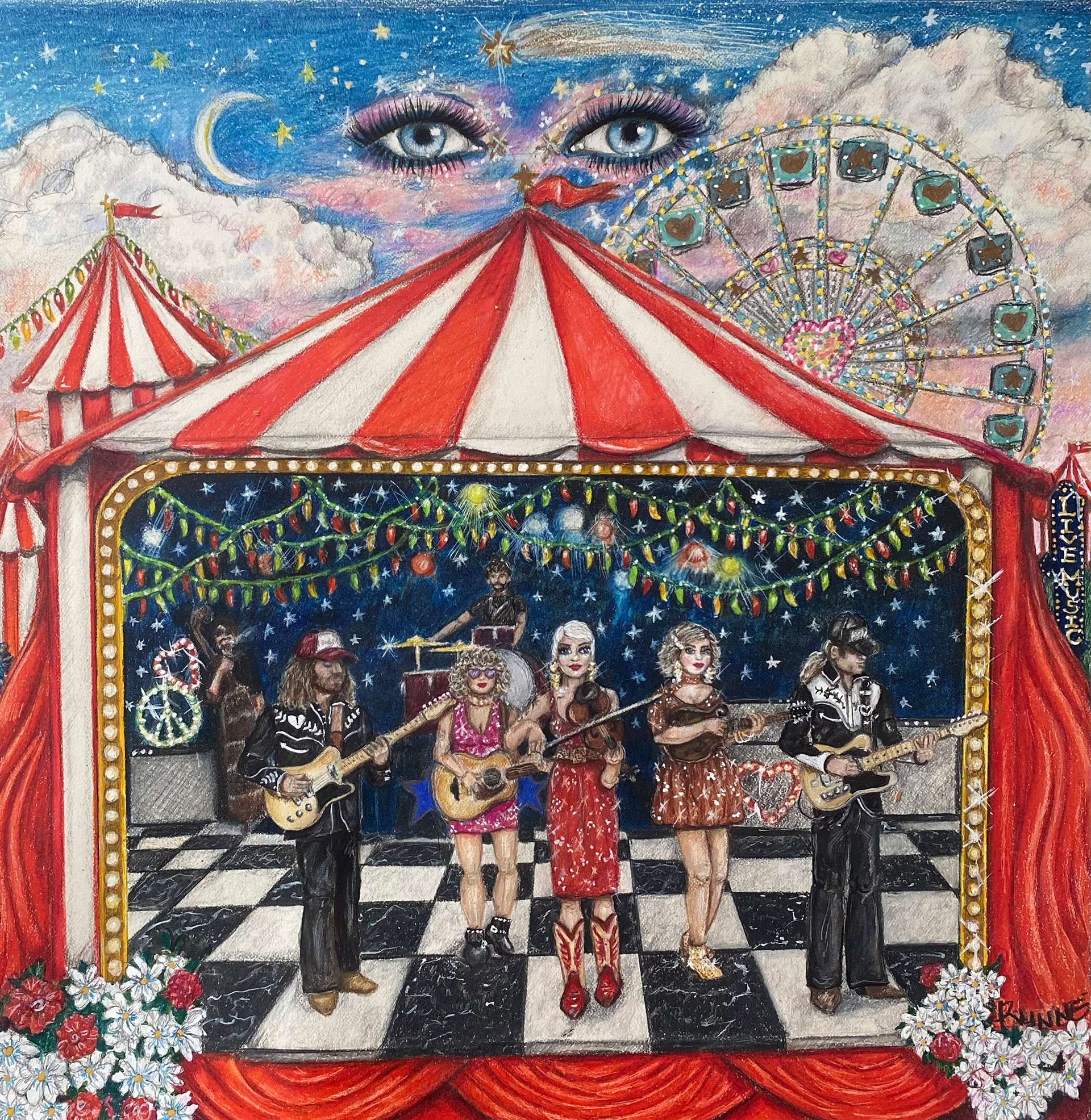 Festival Eyes is an album artwork created for Lillie Mae, illustrated by hand and depicting the musician and her band performing beneath a whimsical, old-world carnival tent. Lillie Mae stands at the center, fiddle in hand, as a pair of celestial eyes watches from above—symbols of intuition, fate, and the unseen forces guiding music and performance. Drawing from folk surrealism and vintage festival imagery, the piece blends magic, mythology, and live sound into a richly layered visual narrative.